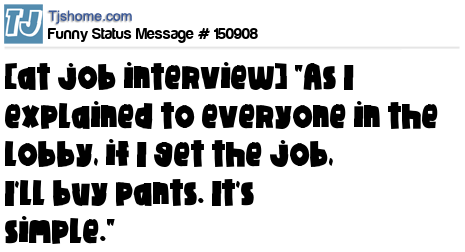 X says [at job interview] "As I explained to everyone in the lobby, if I get the job, I'll buy pants. It's simple."