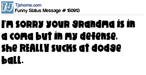 X says I'm sorry your grandma is in a coma but in my defense, she REALLY sucks at dodge ball.