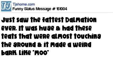 X says Just saw the fattest Dalmation ever. It was huge & had these teats that were almost touching the ground & it made a weird bark, like "moo"