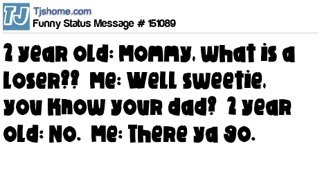 X says 2 year old: Mommy, what is a loser?? Me: Well sweetie, you know your dad? 2 year old: No. Me: There ya go.