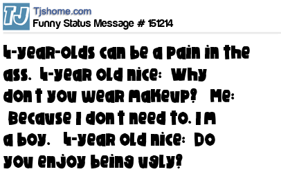 X says 4-year-olds can be a pain in the ass. 4-year old nice: “Why don’t you wear makeup?” Me: “Because I don’t need to. I’m a boy.” 4-year old nice: “Do you enjoy being ugly?”