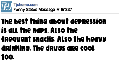 X says The best thing about depression is all the naps. Also the frequent snacks. Also the heavy drinking. The drugs are cool too.