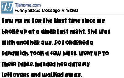 X says Saw my ex for the first time since we broke up at a diner last night. She was with another guy. So I ordered a sandwich, took a few bites, went up to their table, handed her date my leftovers and walked away.