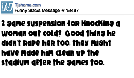 X says 2 game suspension for knocking a woman out cold? Good thing he didn't rape her too, they might have made him clean up the stadium after the games too.