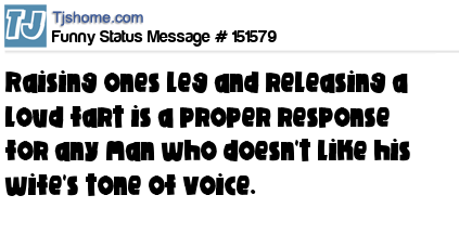 X says Raising ones leg and releasing a loud fart is a proper response for any man who doesn't like his wife's tone of voice.