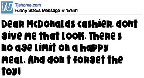 - # 103234 Dear McDonald's cashier, don't give me that look. There's no age limit on a happy meal... and don't forget the toy.