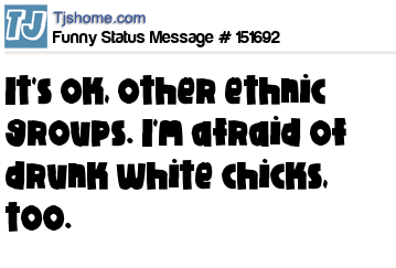 X says It's ok, other ethnic groups. I'm afraid of drunk white chicks, too.