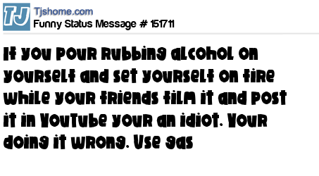 X says If you pour rubbing alcohol on yourself and set yourself on fire while your friends film it and post it in YouTube your an idiot. Your doing it wrong. Use gas