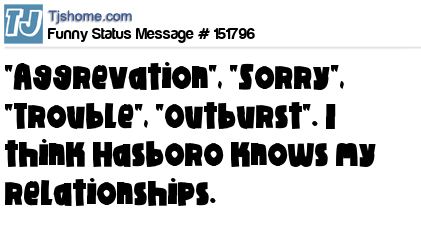 X says "Aggrevation", "Sorry", "Trouble", "Outburst". I think Hasboro knows my relationships.