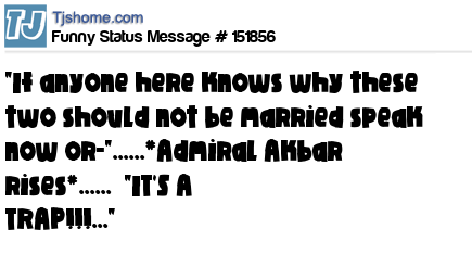 X "If anyone here knows why these two should not be married speak now or-"......*Admiral Akbar rises*...... "IT'S A TRAP!!!..."