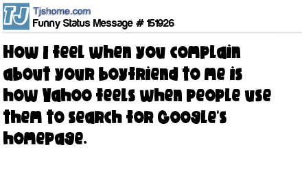 - # 151740 How I feel when you complain about your boyfriend to me is how Yahoo feels when people use them to search for Google’s homepage.