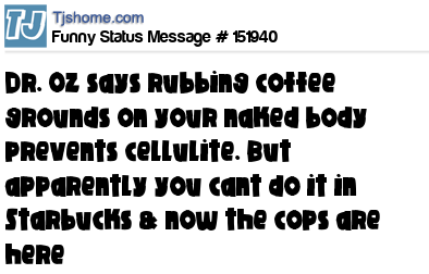 X says Dr. Oz says rubbing coffee grounds on your naked body prevents cellulite. But apparently you cant do it in Starbucks & now the cops are here