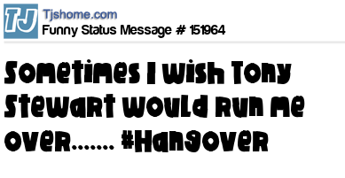 X says Sometimes I wish Tony Stewart would run me over....... #Hangover