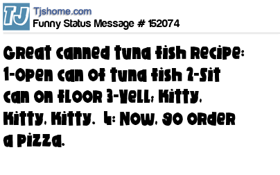X says Great canned tuna fish recipe: 1-Open can of tuna fish 2-Sit can on floor 3-Yell; kitty, kitty, kitty. 4: Now, go order a pizza.