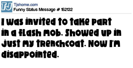 X says I was invited to take part in a flash mob. Showed up in just my trenchcoat. Now I'm disappointed.