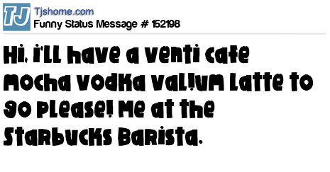 X Hi, i'll have a venti cafe mocha vodka val!um latte to go please! Me at the Starbucks Barista.