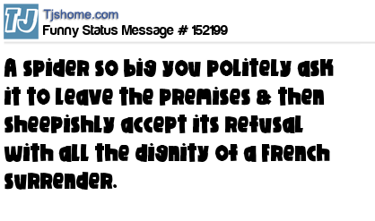 X says A spider so big you politely ask it to leave the premises & then sheepishly accept its refusal with all the dignity of a French surrender.