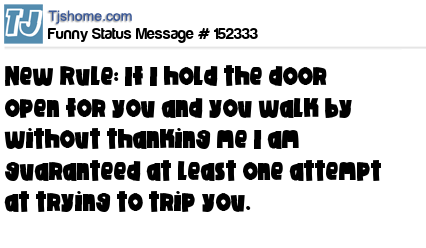 - # 97254 New rule: If you hold the door open for someone and then they just walk by without saying “thanks”, then you're granted one attempt at trying to trip them. >:)
