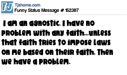 X says I am an agnostic. I have no problem with any faith...unless that faith tries to impose laws on me based on their faith. Then we have a problem.