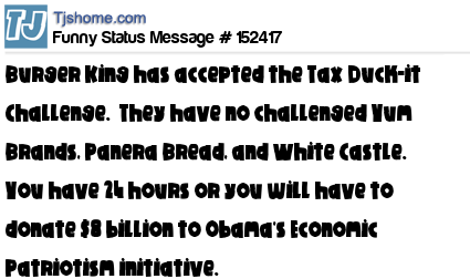 X says Burger King has accepted the Tax Duck-it Challenge. They have no challenged Yum Brands, Panera Bread, and White Castle. You have 24 hours or you will have to donate $8 billion to Obama's Economic Patriotism initiative.