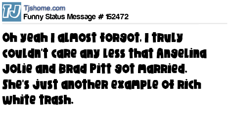 X Oh yeah I almost forgot, I truly couldn't care any less that Angelina Jolie and Brad Pitt got married. She's just another example of rich white trash.