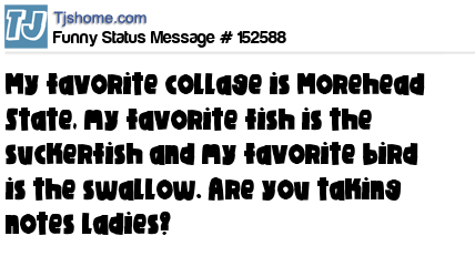 X says My favorite collage is Morehead State, my favorite fish is the suckerfish and my favorite bird is the swallow. Are you taking notes ladies?