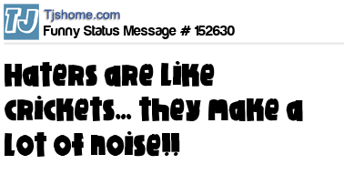 - # 147386 Haters are like crickets… they make a lot of noise, you can hear them, but you can't see them… when you walk right by them, they suddenly get