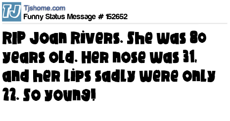 X says RIP Joan Rivers. She was 80 years old. Her nose was 31, and her lips sadly were only 22. So young!