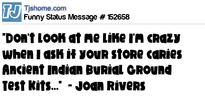 X "Don't look at me like I'm crazy when I ask if your store caries Ancient Indian Burial Ground Test Kits..." - Joan Rivers