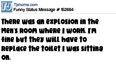X says There was an explosion in the Men's room where I work. I'm fine but they will have to replace the toilet I was sitting on.