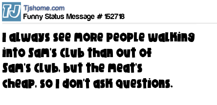 X says I always see more people walking into Sam's Club than out of Sam's Club, but the meat's cheap, so I don't ask questions.