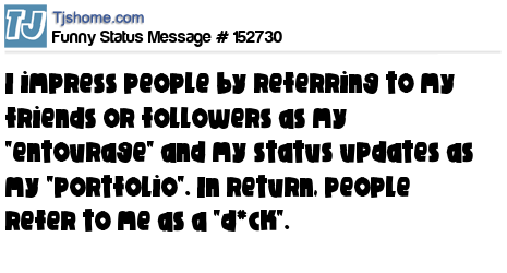 X I impress people by referring to my friends or followers as my "entourage" and my status updates as my "portfolio". In return, people refer to me as a "d*ck".