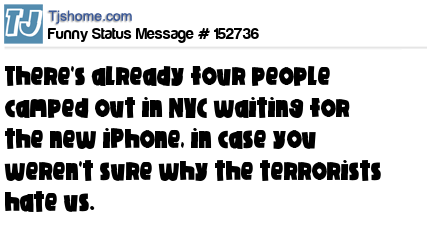 X says There's already four people camped out in NYC waiting for the new iPhone, in case you weren't sure why the terrorists hate us.