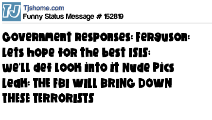 X says Government responses: Ferguson: lets hope for the best ISIS: we'll def look into it Nude Pics Leak: THE FBI WILL BRING DOWN THESE TERRORISTS