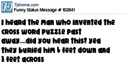 X says I heard the man who invented the cross word puzzle past away....did you hear this? yea they buried him 6 feet down and 3 feet across