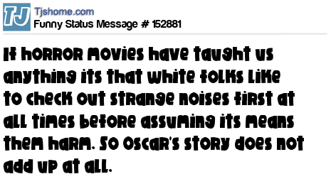X says If horror movies have taught us anything its that white folks like to check out strange noises first at all times before assuming its means them harm. So Oscar's story does not add up at all.