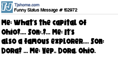 X Me: What's the capital of Ohio?.... Son:.?... Me: It's also a famous explorer.... Son: Dora? ... Me: Yep,, Dora, Ohio.