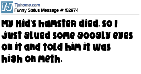 X My kid's hamster died, so I just glued some googly eyes on it and told him it was high on meth.