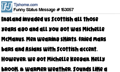 X says England invaded us Scottish all those years ago and all you got was Michelle McManus, Men wearing skirts, fried mars bars and Asians with Scottish accent. However, we got Michelle Keegan, kelly brook, & warmer weather. Sounds like a good deal to me...
