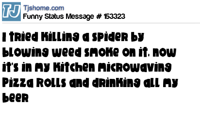 X says I tried killing a spider by blowing weed smoke on it, now it's in my kitchen microwaving Pizza Rolls and drinking all my beer