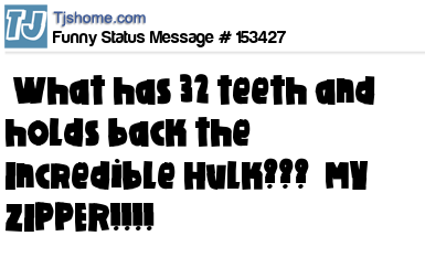 X says What has 32 teeth and holds back the Incredible Hulk??? MY ZIPPER!!!!
