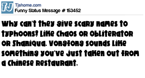 X says Why can't they give scary names to typhoons? Like Chaos or Obliterator or Shaniqua. Vongfong sounds like something you've just taken out from a Chinese restaurant.