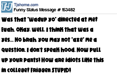 X Was that "wadup yo" directed at me? Euah. Okay, well, I think that was a yes... No brah, you may not "axe" me a question. I don't speak hood. Now pull up your pants! How are idiots like this in college? Friggen STUPID!