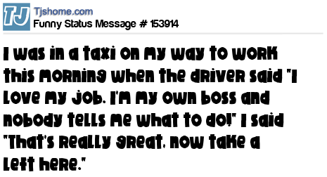 X I was in a taxi on my way to work this morning when the driver said "I love my job. I'm my own boss and nobody tells me what to do!" I said "That's really great, now take a left here."