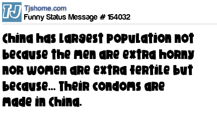 X says China has largest population not because the men are extra horny nor women are extra fertile but because... Their condoms are made in China.