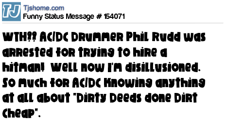 X WTH?? AC/DC Drummer Phil Rudd was arrested for trying to hire a hitman! Well now I'm disillusioned. So much for AC/DC knowing anything at all about "Dirty Deeds done Dirt Cheap".
