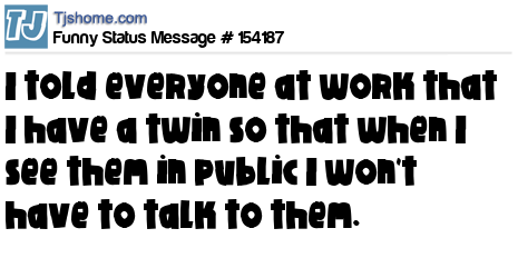 - # 158637 I told everyone at work that I have a twin so that when I see them in public I won’t have to talk to them.