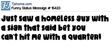 - # 67463 I saw a homeless guy holding a sign that said "Bet you cant hit me with a quarter!" I bet he didn't expect me to use a sling shot.