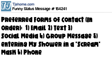 X says Preferred Forms of Contact (In Order): 1) Email 2) Text 3) Social Media 4) Group Message 5) entering My Shower in a "Scream" Mask 6) Phone