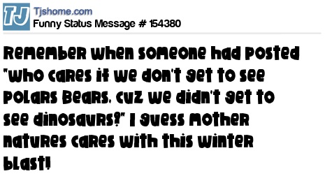 X Remember when someone had posted "who cares if we don't get to see polars Bears, cuz we didn't get to see dinosaurs?" I guess mother natures cares with this winter blast!